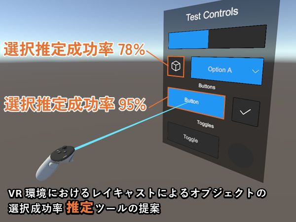 XRデバイスの普及により三次元空間におけるインタラクションが一般化する中,UI開発者はより優れたユーザ体験を実現するためにユーザビリティへの配慮が強く求められている.HCI分野では,この課題解決のため古くからポインティング研究が行われ,三次元空間を対象とした研究も大きく進展している.しかし,研究が進む一方で,そこで得られた指針を実際の開発者がUI改善のサイクルに直接活用するためには,実用的なツールを提供することが求められる.本研究は,VR開発におけるこの「研究と開発のギャップ」を埋めることを目指し,開発ツール内でオブジェクトの選択成功率を推定するシステムを提案する.本稿ではその理論の検証を行い,ツールの機能について説明する.また,VR開発者に本ツールを試用してもらい,そのフィードバックから有用性を検証する.