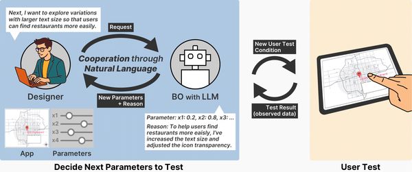 効果的なインタラクション設計には,最適なパラメタの特定が必要である.そのためデザイナは反復的なユーザテストや試行錯誤を行うが,このプロセスは多次元空間における複数の目的のバランスを取る必要があり,時間と認知的負荷を要する.他方,ベイズ最適化等に基づくシステム主導型手法は,次に試すべきパラメタを提示できるが,デザイナが最適化に介入できる機会は限られ,体験を損なう恐れがある.本研究では,自然言語を通じてデザイナと最適化システムの協調を可能にするデザイン最適化フレームワークを提案する.システム主導型最適化と大規模言語モデルを統合し,デザイナが最適化プロセスへ介入しつつ,システムの推論理解を可能にする.実験結果から,提案手法はシステム主導型よりユーザの行為主体感が高く,手動設計に比べて有望な最適化性能を示した.さらに既存の協調型手法と遜色ない性能を発揮しつつ,認知的負荷を低減することが示された.